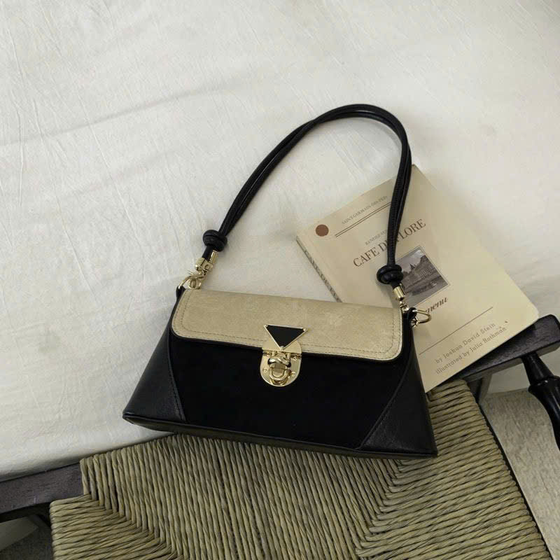 A standout detail is the triangle-shaped gold clasp, paired with a polished lock that adds a luxurious finish. The bag includes a double-strap handle with adjustable knots and gold hardware, giving it a stylish yet practical feel for everyday use.