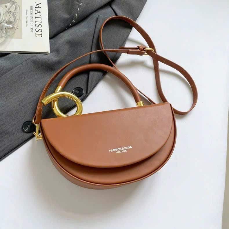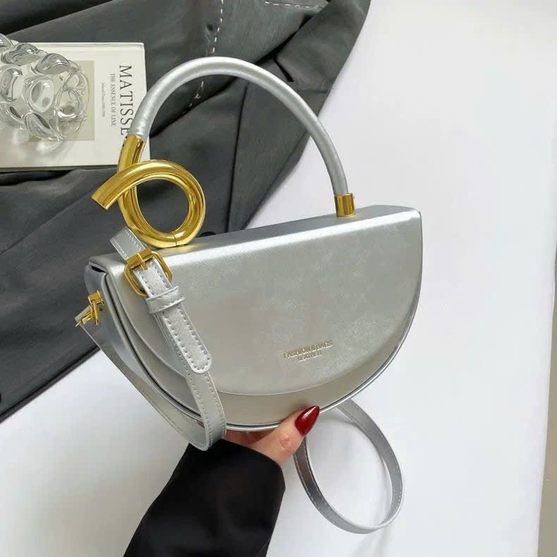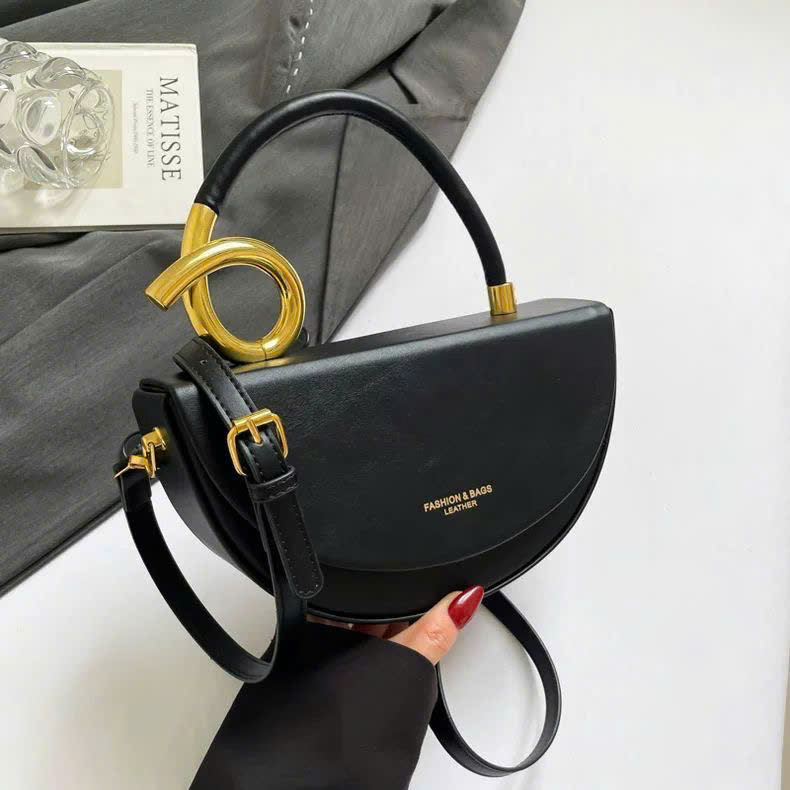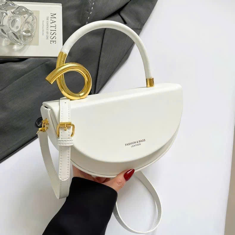 This stylish shoulder bag features a sleek half-moon silhouette crafted from smooth, premium faux leather with a refined matte finish. Its standout detail is the unique sculptural gold-tone handle, designed with an artistic swirl shape that adds a modern, high-fashion touch to the overall look.